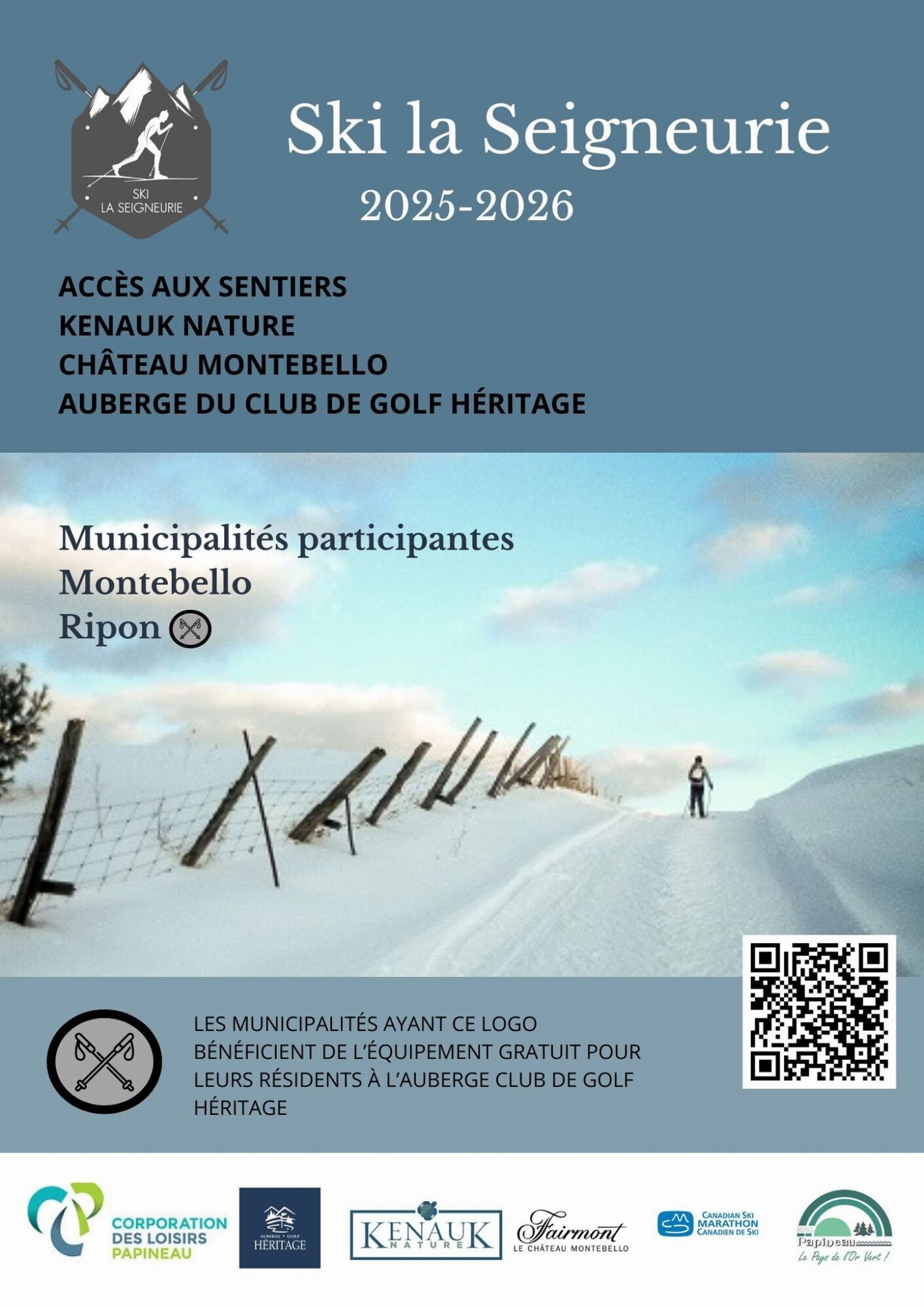 Pour la saison 2025-2026, les résidents des municipalités participantes pourront aller skier gratuitement sur le réseau des quatre pistes du Château Montebello, du réseau de sentiers de Kenauk Nature ainsi que des sentiers à l'Auberge Club de Golf Héritage. Cette initiative permet d'offrir plus de 65 km de sentiers de qualités exceptionnelles afin de faire bouger les familles à l'extérieur durant la saison hivernale.